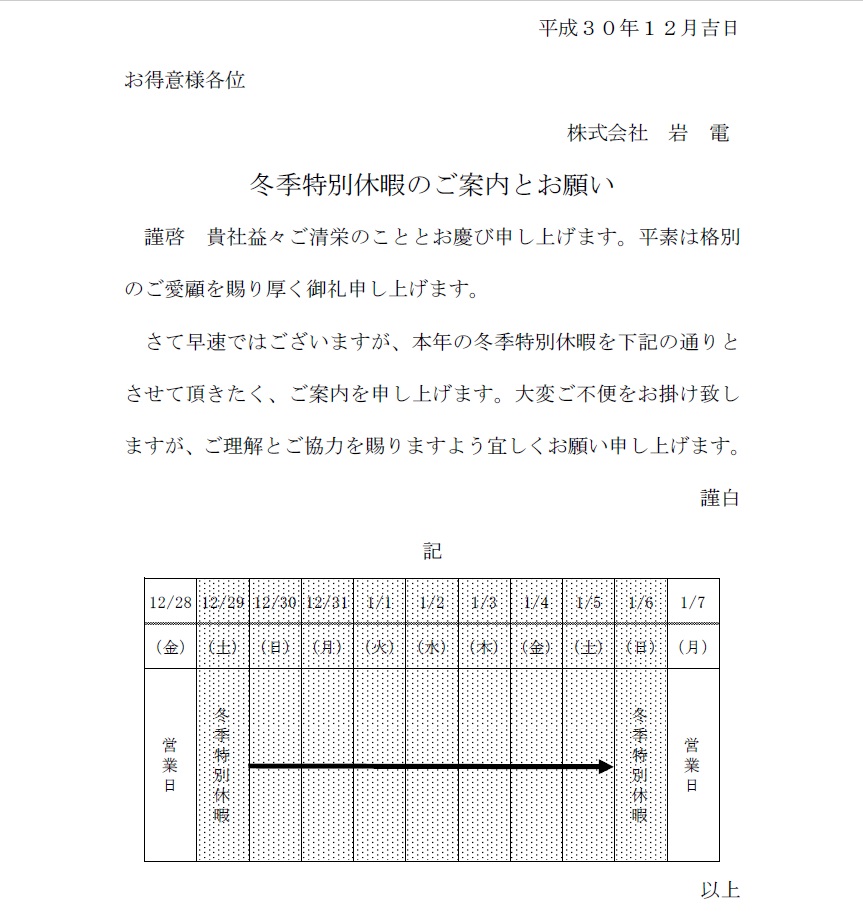 冬季特別休暇のご案内と御願い
